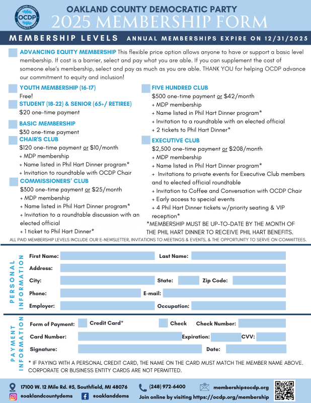 In 2025, the Oakland County Democratic Party is focused on finding Democratic candidates to run in local elections, promoting social and economic justice, and building an engaged Democratic majority in Oakland County in order to enhance the quality of life for all. Please join the OCDP to help continue to move Michigan forward.
